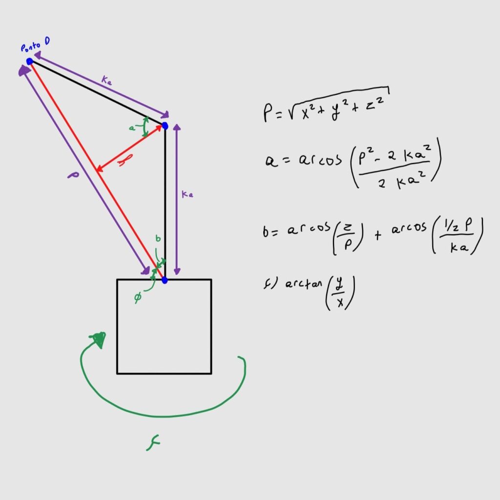 Um detalhe importante nessas fórmulas é que, como vamos controlar servosmotores, precisamos converter radianos em graus, por isso, multiplicamos por 180 e dividimos por pi.
